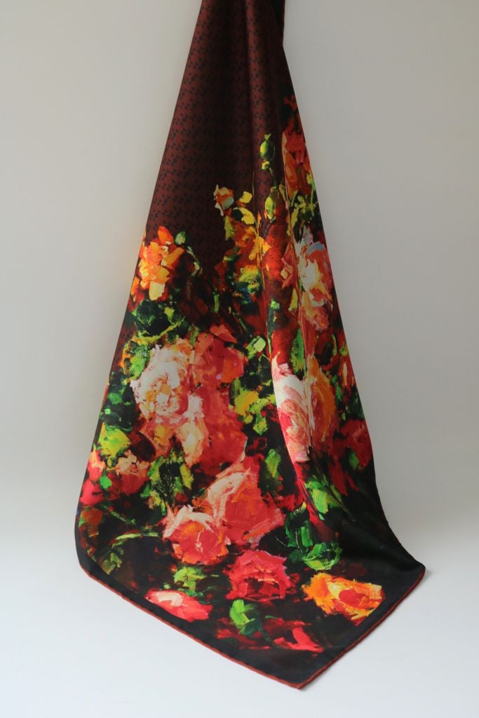 Họa tiết rực rỡ trên chiếc khăn lụa mang hình ảnh về bức tranh hoa hồng nở rộ trong khu vườn cổ tích. Những cánh hoa hé mở như một nữ hoàng kiêu hãnh vừa tỉnh giấc, hương thơm lan tỏa khắp không gian.