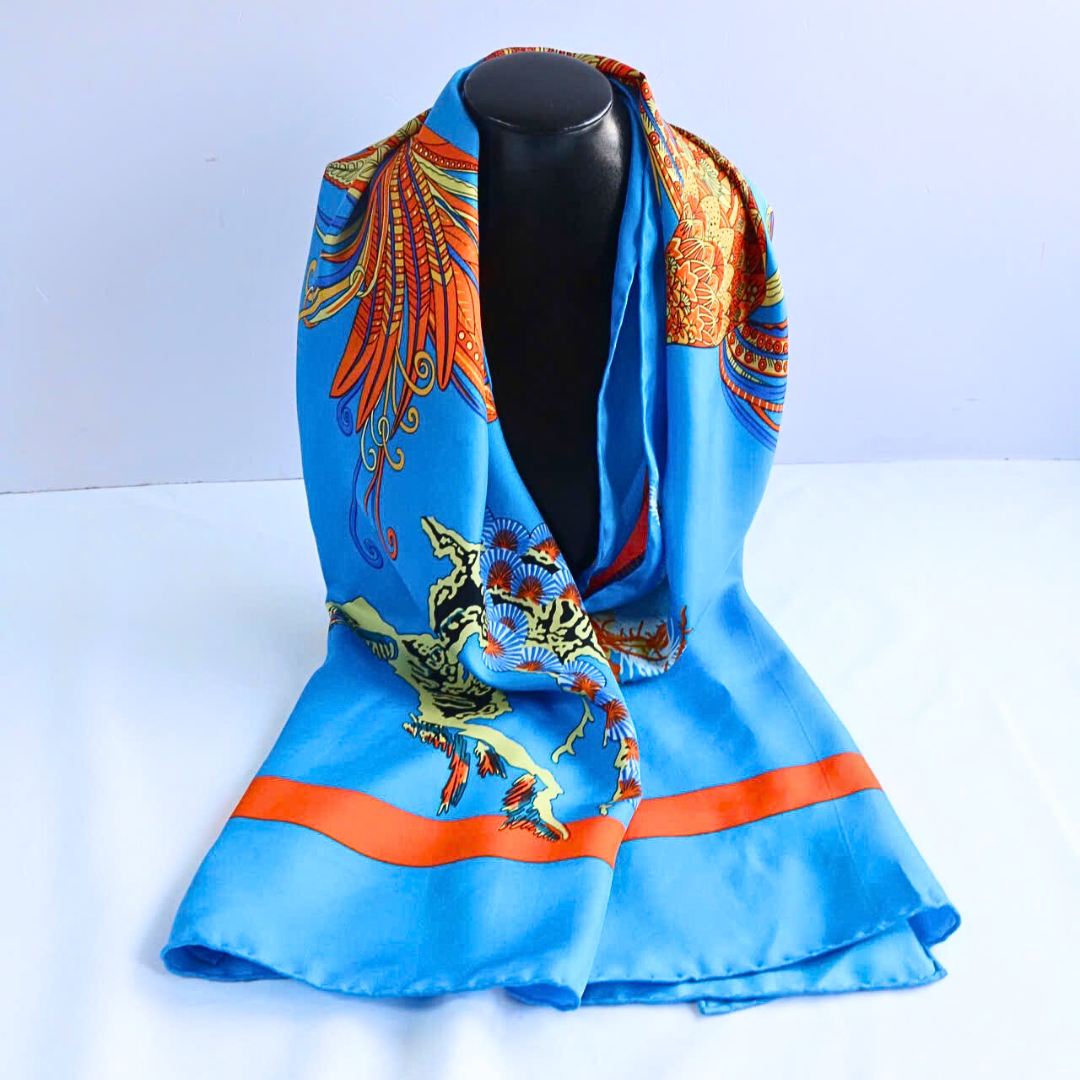 Khăn lụa tơ tằm "Kim sắc Phượng Hoàng" là bản giao hưởng của vẻ đẹp truyền thống và hiện đại, nơi hình ảnh chim phượng hoàng kiêu sa dang rộng đôi cánh trên nền trời xanh thẳm trở thành biểu tượng đầy ý nghĩa.